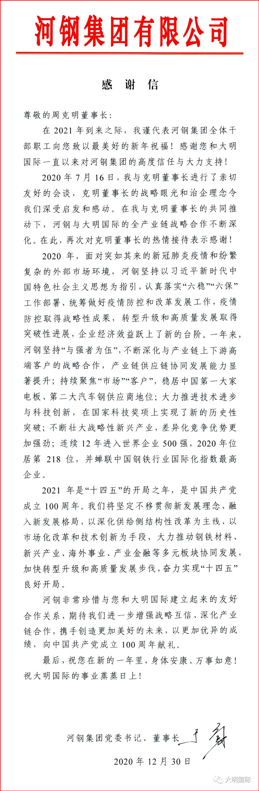 2021年新年之際,于勇董事長特致信大明國際,對雙方全產業(yè)鏈戰(zhàn)略合作所取得的成功給予了肯定,并希望進一步增強戰(zhàn)略互信、深化產業(yè)鏈合作、攜手共創(chuàng)。大明國際將繼續(xù)一如既往地與河鋼合作推進重大工程項目,戰(zhàn)略客戶服務,為客戶協(xié)同創(chuàng)造價值,強化“鋼廠—大明—客戶”產業(yè)鏈合作模式。