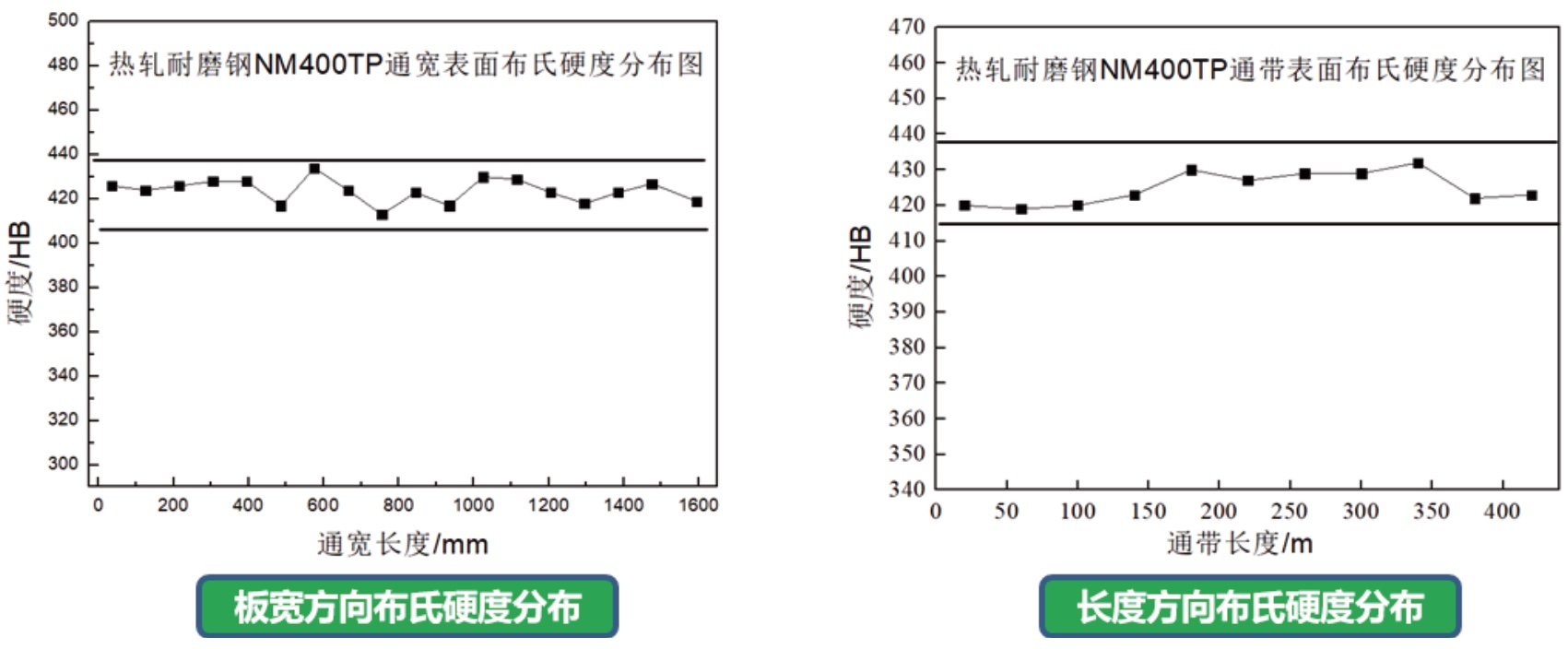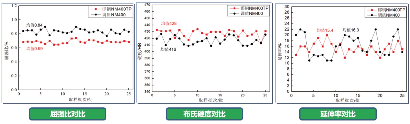 NM400TP性能分布情況(45個批次):布氏硬度高度均勻,波動<±15HBW,均勻磨損,保證使用壽命。抗拉強度≥1400MPa,延伸率>11%,保證馬氏體超高強耐磨鋼的加工、成型性能。